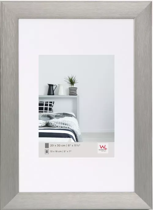 Der Alurahmen Aluline hat ein rechteckiges Profil mit matt gebürsteter Oberfläche in Schwarz, Stahl oder Silber. Der Rahmen Aluline von der Bilderrahmenmarke Walther kommt bis zur Größe 20 x 30 cm mit Aufsteller und ab 40 x 50 cm mit Galerieaufhängung.
