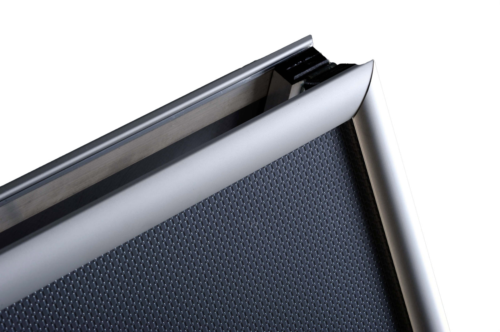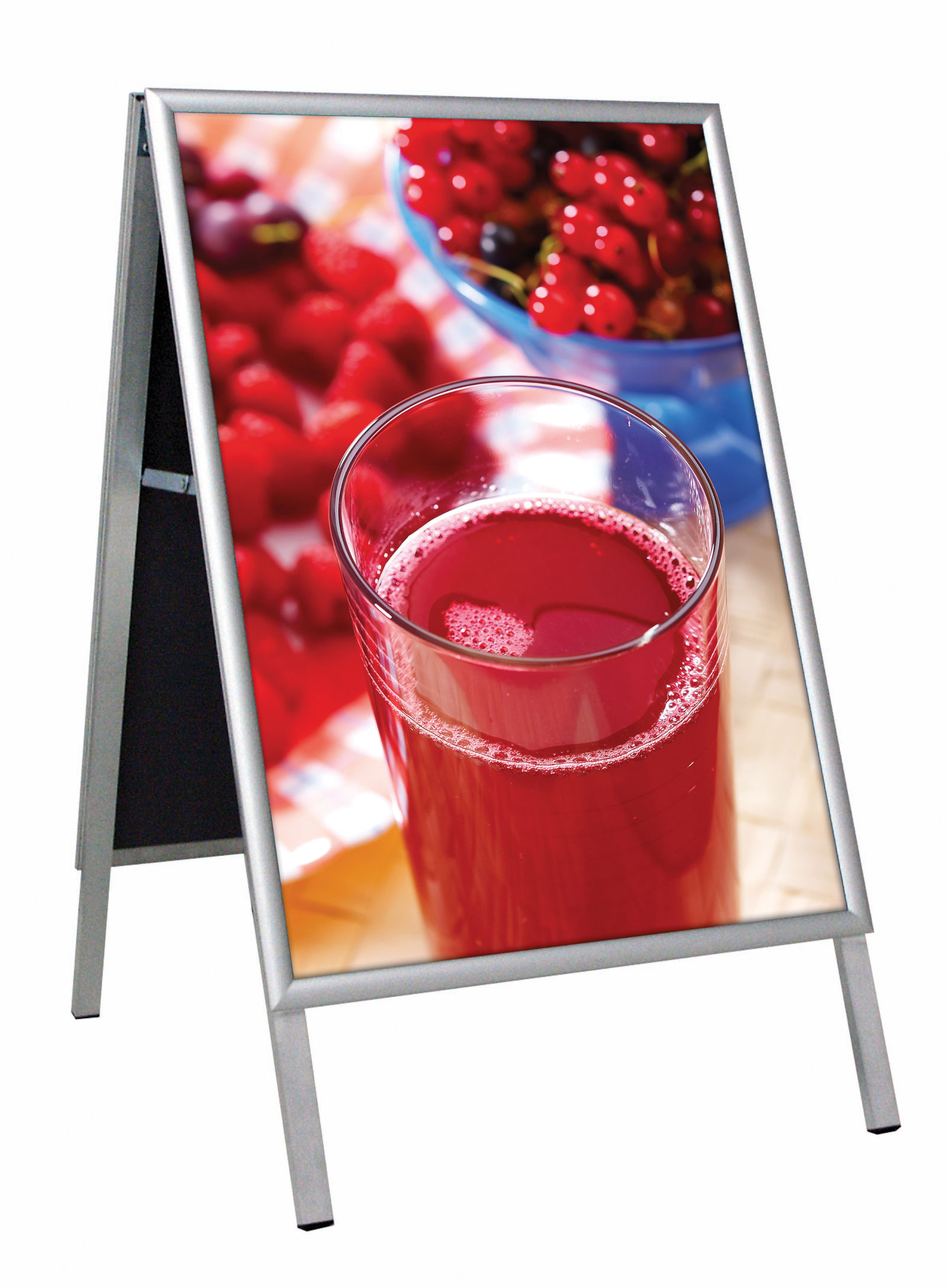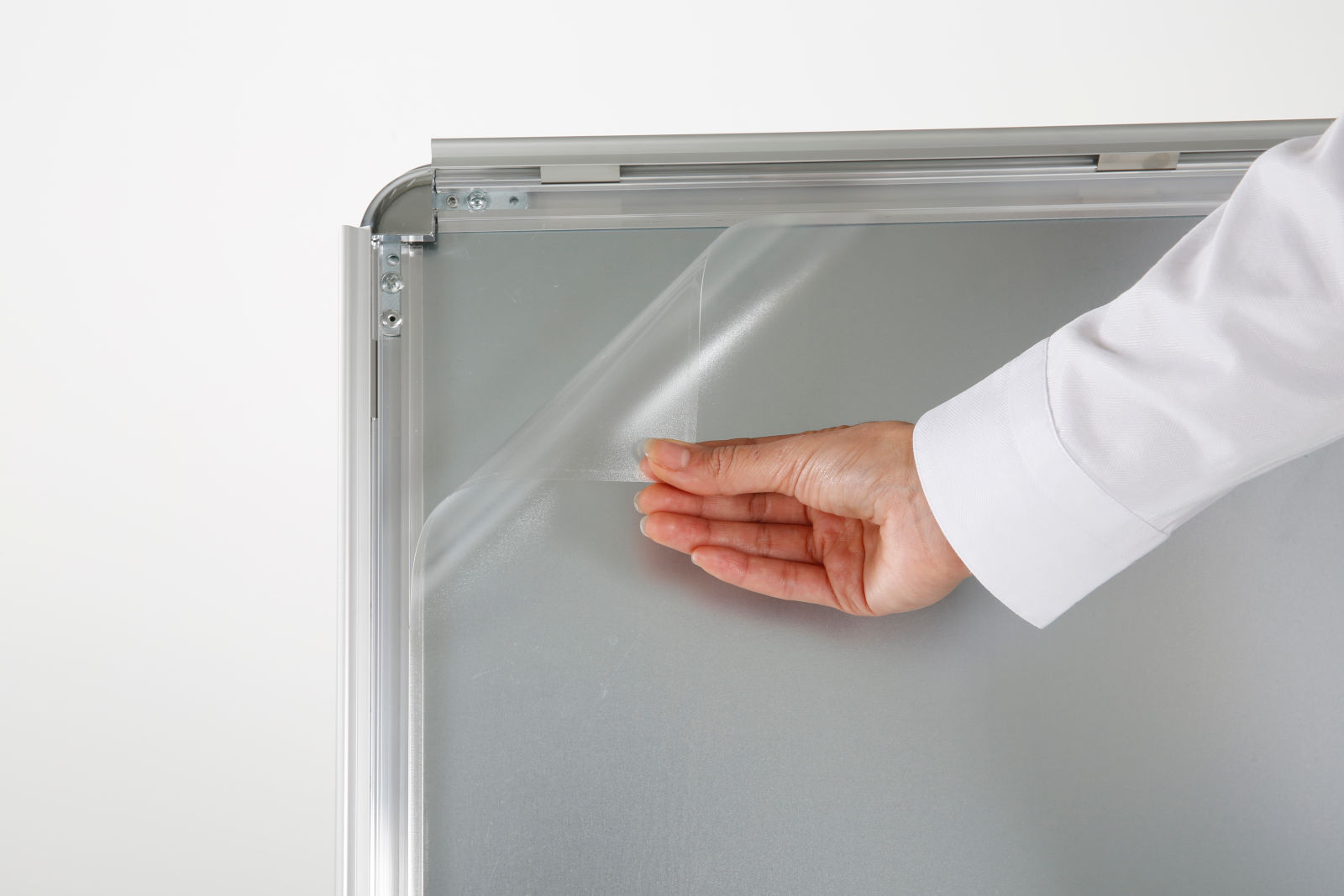 Der Plakatwechsel ist durch das Klapprahmenprofil schnell und einfach. Durch die Antireflexfolien ist das Werbeplakat geschützt und im Innenbereich einsetzbar.