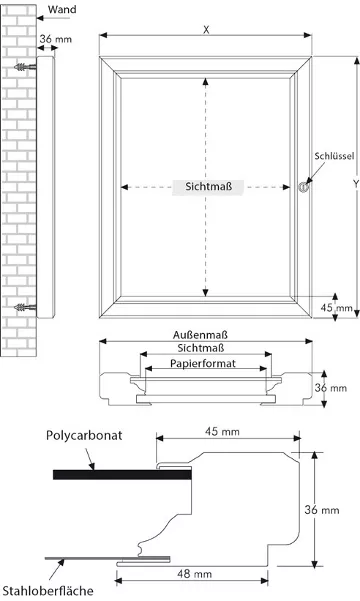 - Lieferung einschließlich 10 schwarzer Magnete, Schlüssel(n) sowie Schrauben und Dübeln zur Wandmontage